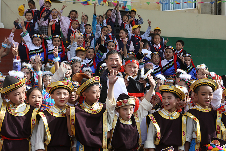 艺术团赴西藏拉萨雪小学进行艺术指导,图为濮存昕主席与小学生们在一起